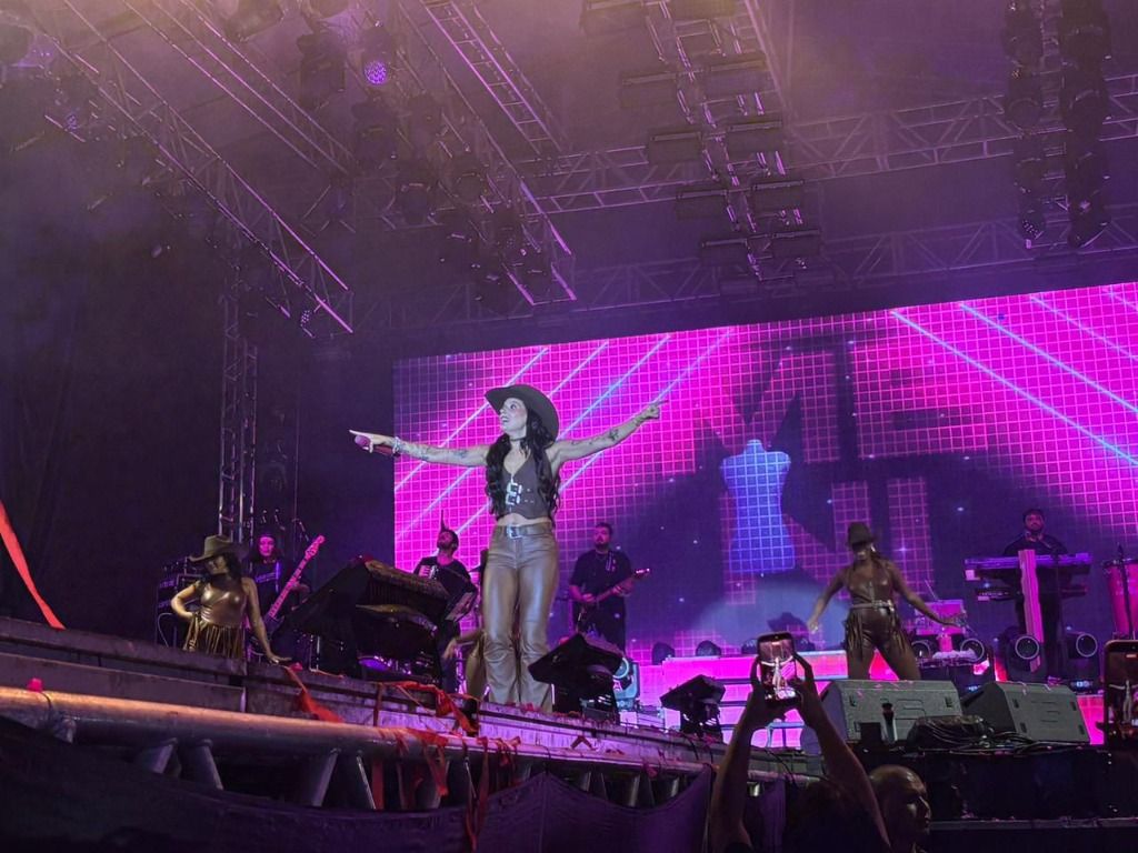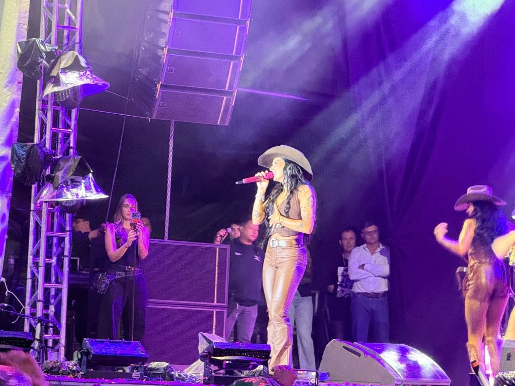 Quando subiu ao palco, por volta das 23h, Ana Castela foi recebida com entusiasmo pelo público. Durante o show, a artista apresentou sucessos que marcaram sua carreira, como “Nosso Quadro”, “Solteiro Forçado”, “Olha Onde Eu Tô” e diversas outras, levando os fãs a cantar em coro e transformando o parque da feira em um grande espetáculo de música.