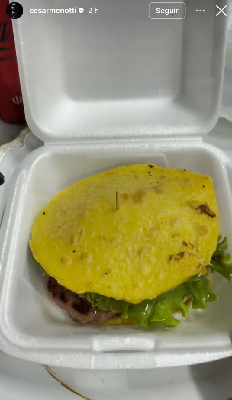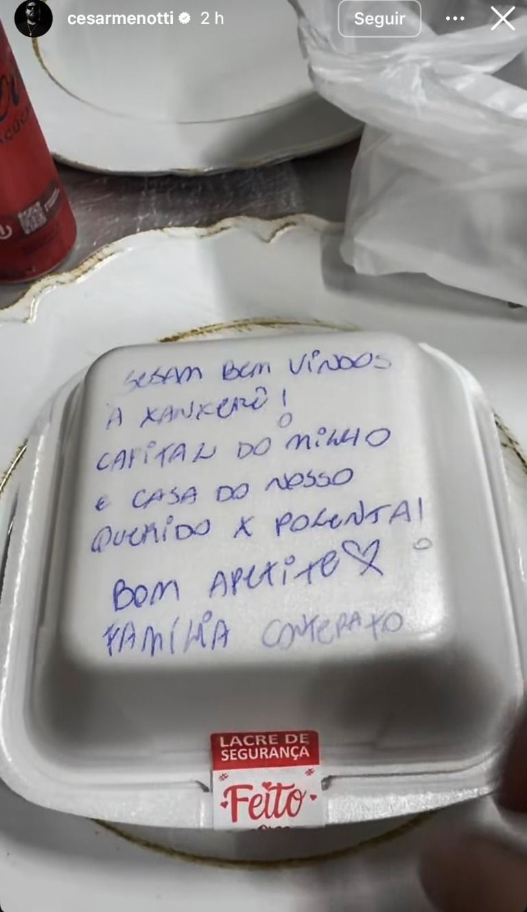 “Olha o carinho da galera: já me mandaram um aqui de presente no camarim. Vou mostrar para vocês como é que é essa maravilha. Olha isso! No lugar do pão, duas polentas. Tem base que isso aqui é bom demais, cara. Meu Deus do céu!”, disse.