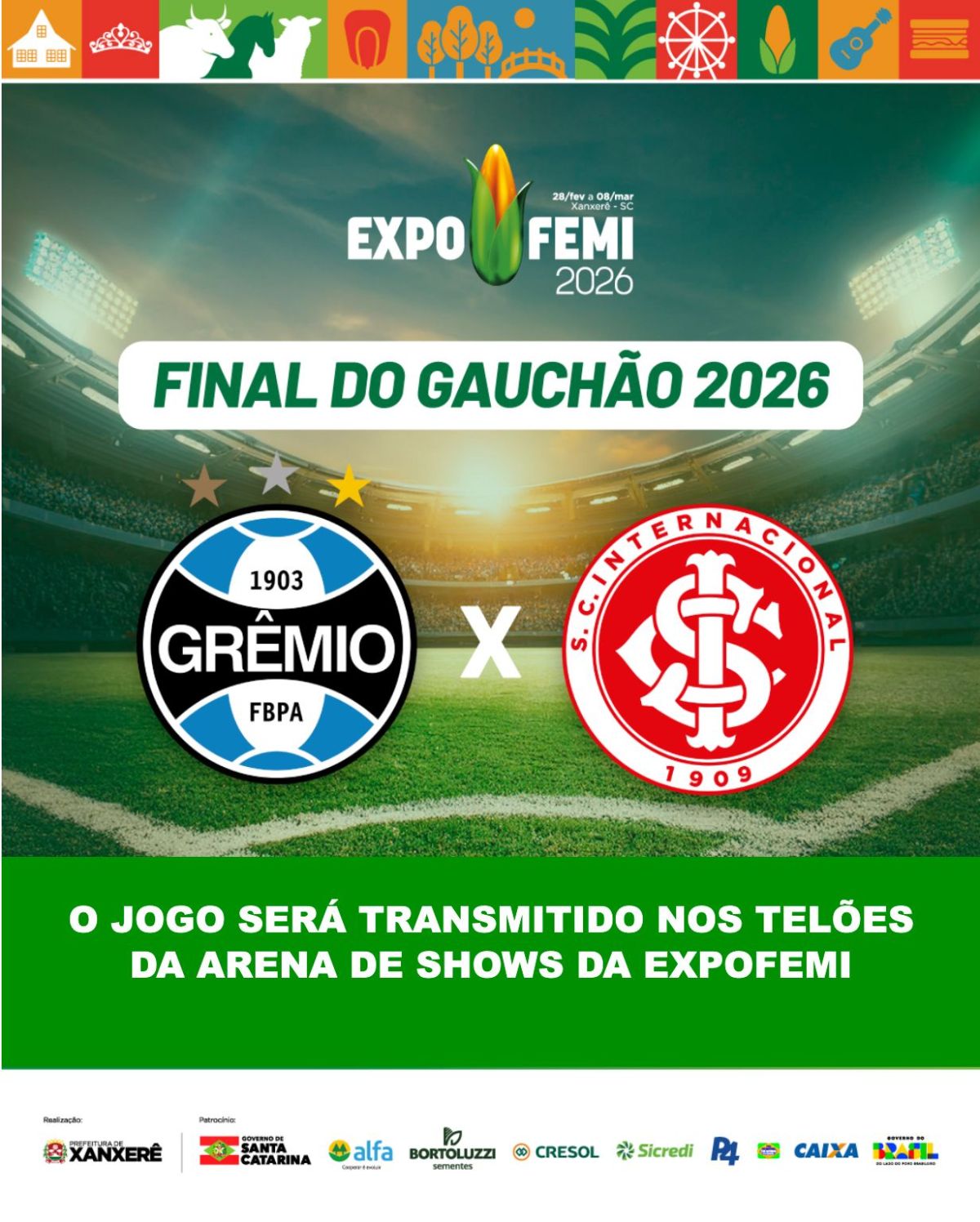 Os visitantes da ExpoFemi 2026 poderão acompanhar um dos jogos mais aguardados do futebol gaúcho durante a programação deste domingo (08), último dia da feira em Xanxerê. A final do Campeonato Gaúcho entre Grêmio e Internacional será transmitida ao vivo a partir das 18h nos telões da arena de shows, no Parque de Exposições Rovilho Bortoluzzi.