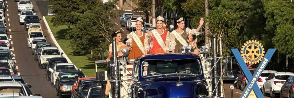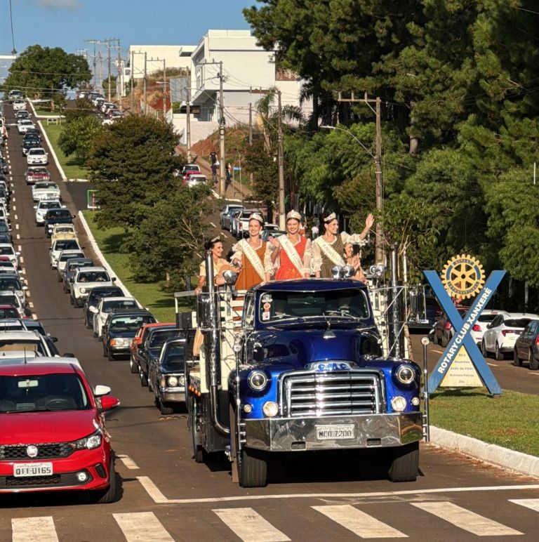 As soberanas da ExpoFemi 2026 participaram, neste sábado (28), de uma carreata com carros antigos pelas principais ruas do Centro de Xanxerê. A programação iniciou às 17h e antecedeu a abertura oficial da feira, realizada às 19h, no Parque de Exposições Rovilho Bortoluzzi.