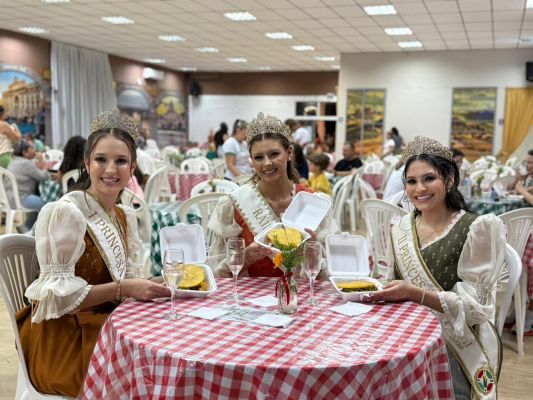A rainha Rayssa Kemely Padilha, a primeira princesa Nathalia Menegolla e a segunda princesa Khrys Hellen Bordin de Lima foram recebidas com alegria pelos membros da associação, que prepararam o ambiente com canto italiano, reforçando a forte ligação cultural do espaço com as tradições do município.