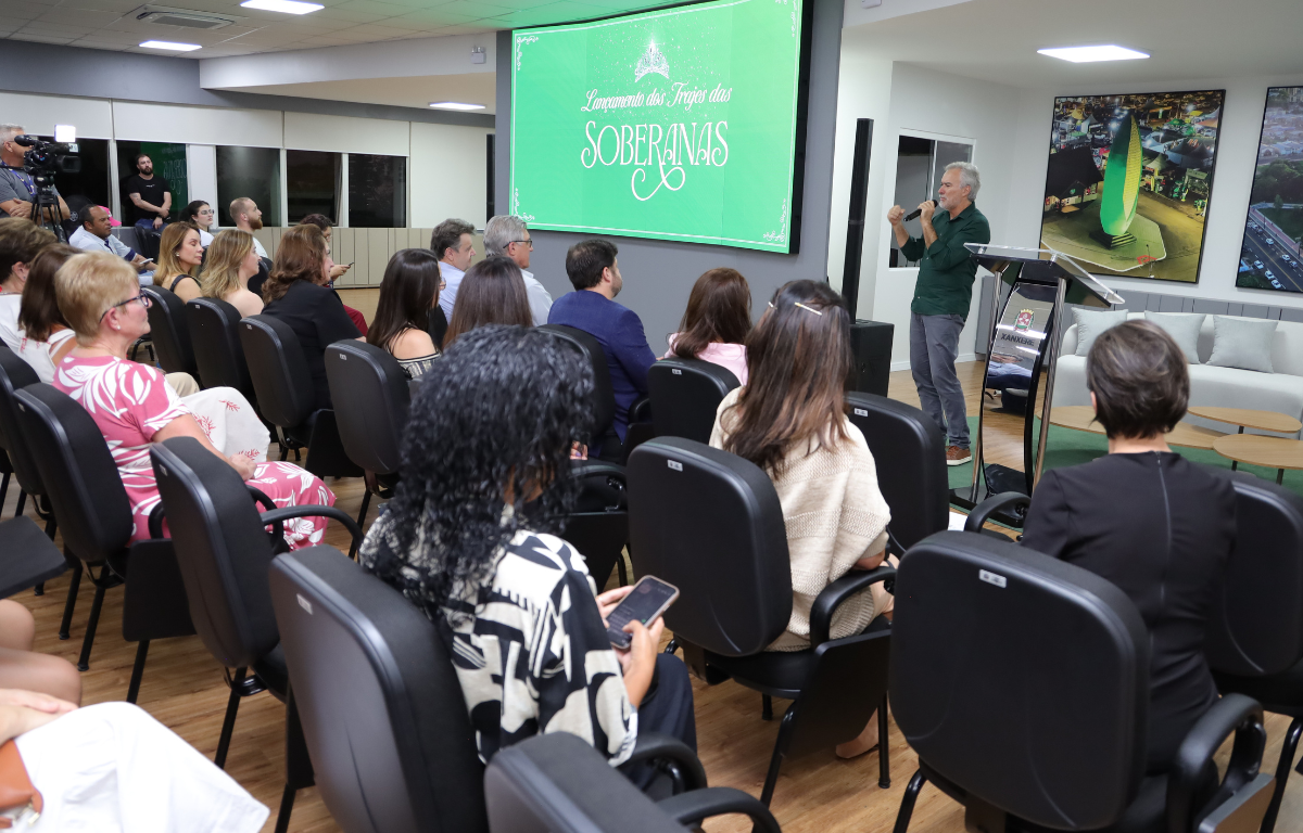 Durante o lançamento, também foram apresentados os trajes das representantes da terceira idade, que simbolizam o “Melhor Conviver” do município em eventos locais e regionais. Diferentemente dos vestidos temáticos das soberanas, essas peças foram pensadas para serem atemporais e versáteis, com tons neutros, renda e pérolas, traduzindo sobriedade e elegância.